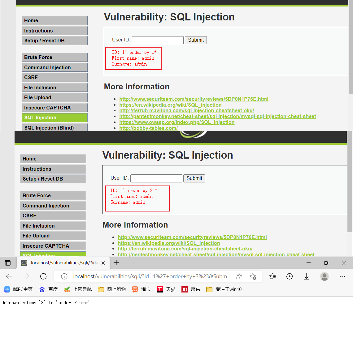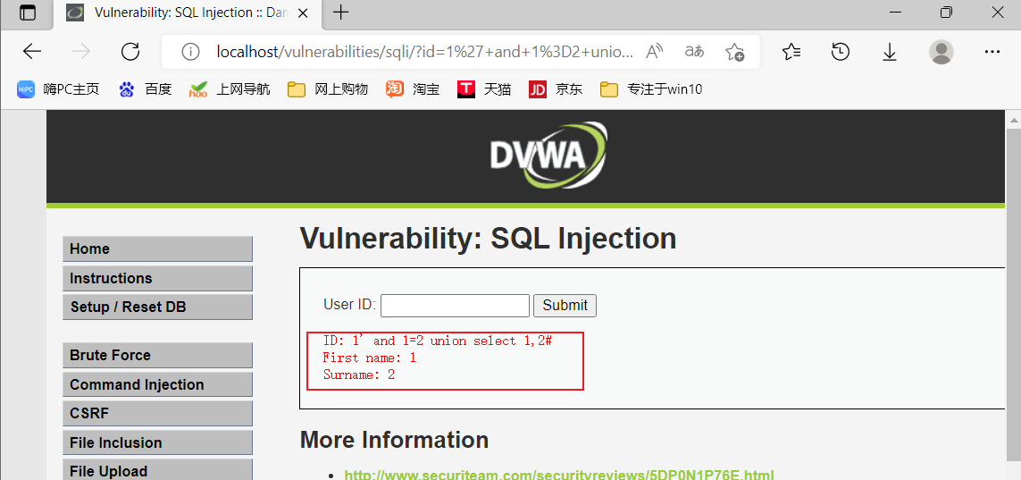 VI.找回显点,在文本框输入1' and 1=2 union select 1,2#,确认页面中First name处显示的是记录集中第一个字段,Surname处显示的是记录集中第二字段,如图1-6