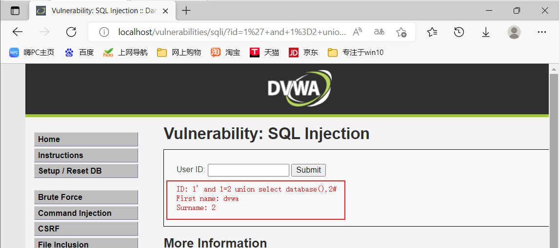 VII.在文本框输入1' and 1=2 union select database(),2#,原第一个字段处显示当前数据库名称为dvwa,如图1-7