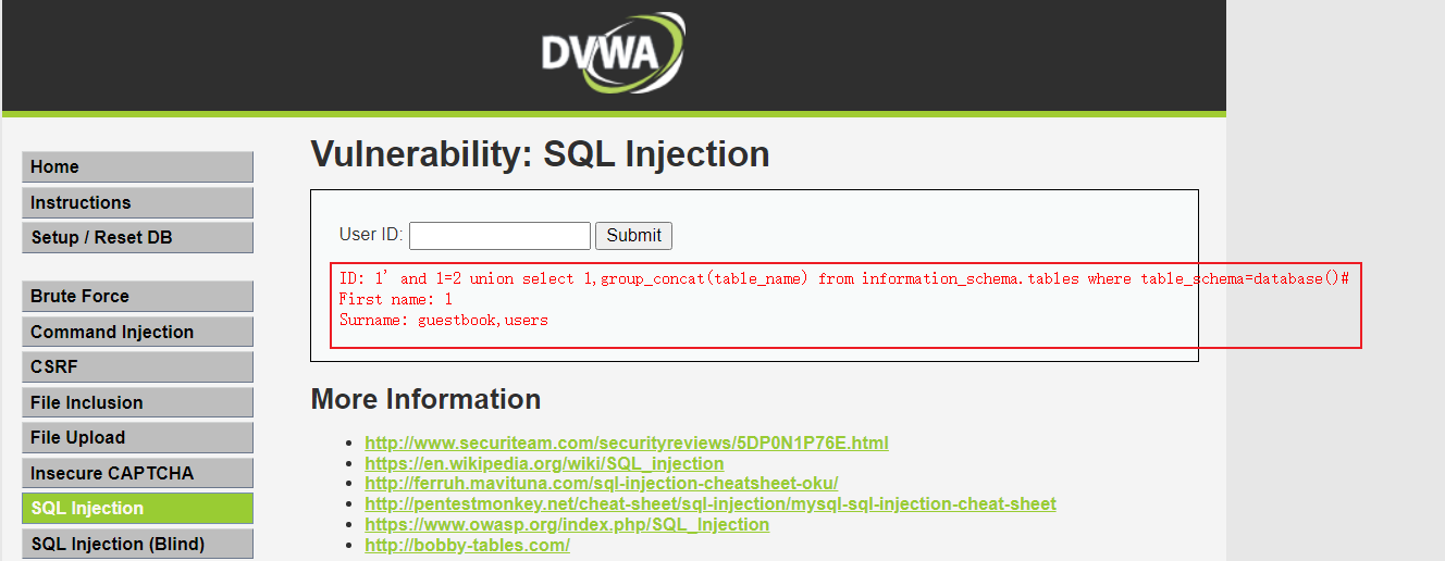 II. 获取dvwa数据库有哪些表