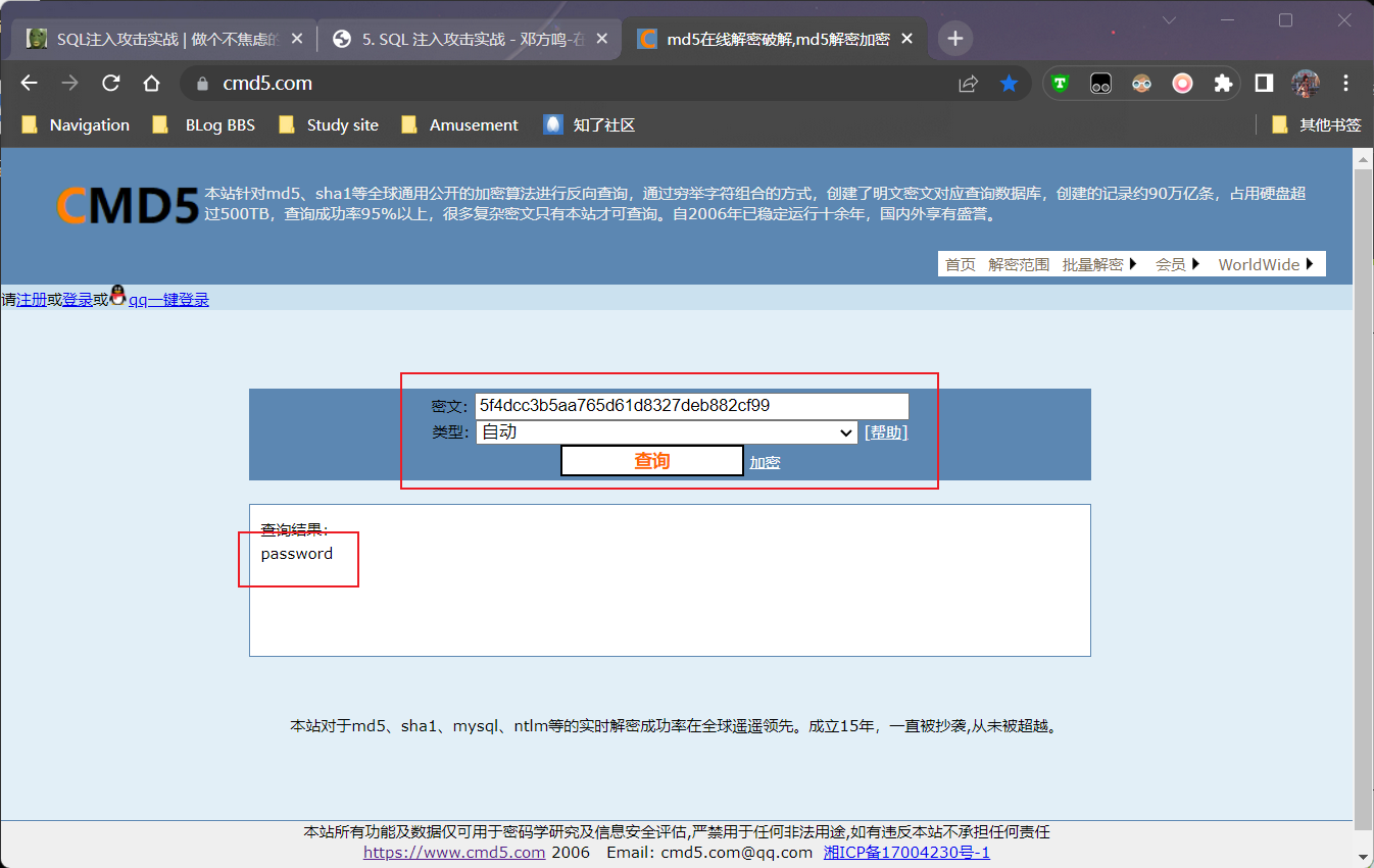 XI.在http://www.cmd5.com/线破解MD5加密密码,即可得到密码明文,如图1-11